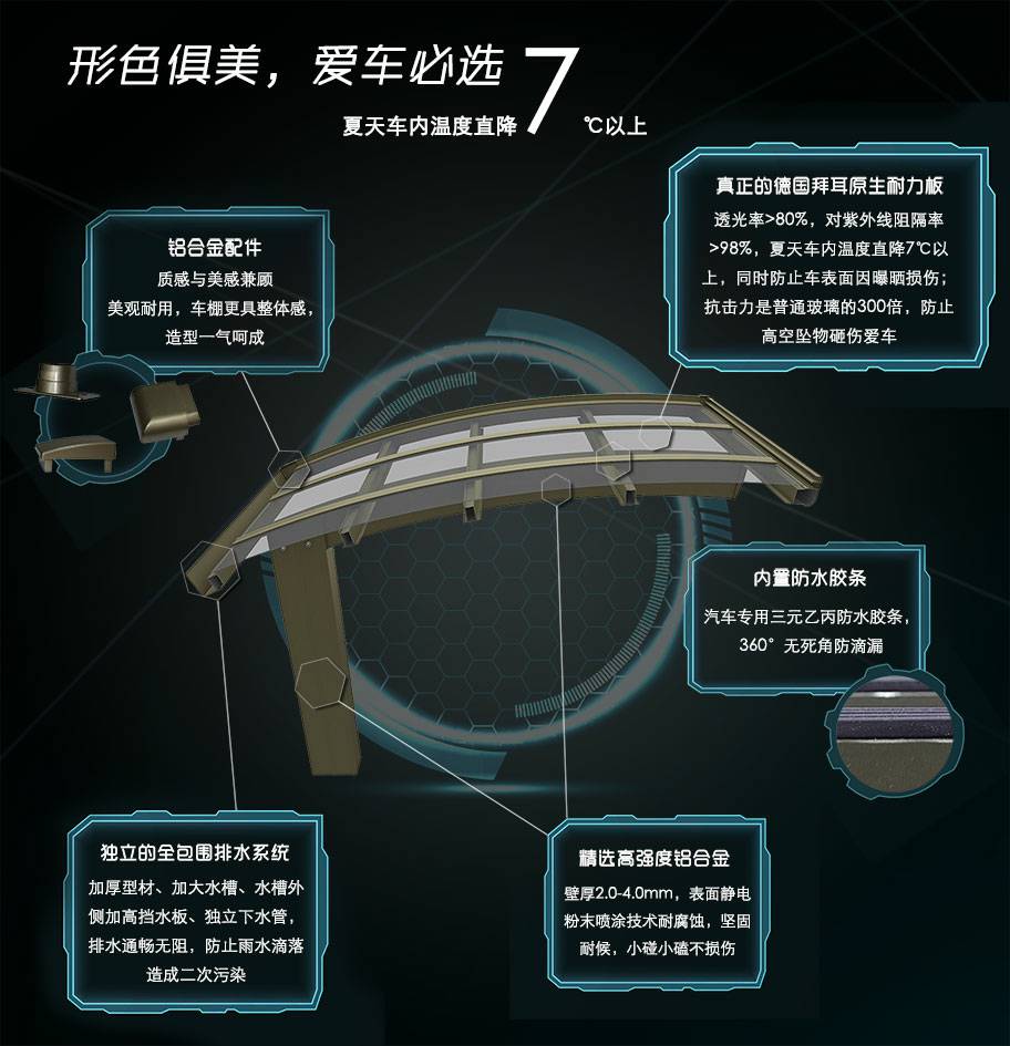 开云网页版·官方页面网站-开云(中国)车棚系列全部采用高品质、高强度铝合金材料精加工而成,具备的氧化保护能力,不生锈,表面特殊的工艺处理,大大提高了车棚的使用寿命。顶棚使用添加了防止紫外线涂层的德国拜耳耐力板,降低了来自紫外线的分解,历久弥新,成就了优越的耐候性。