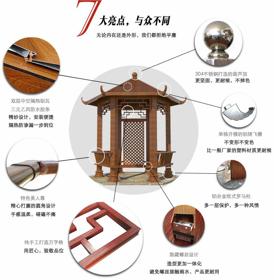 款式:四角凉亭、六角凉亭、八角凉亭、六角双层凉亭、六角双层弯弧凉亭、欧式凉亭